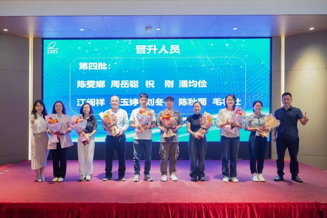 随后,仪式进入了表彰颁奖环节。颁奖分六批次进行,每位晋升员工都荣获了象征荣誉的鲜花和晋升徽章,这不仅是对他们努力的认可,更是对未来的期许。